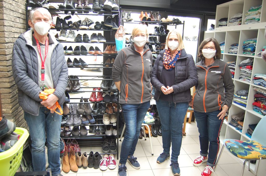 Auf Einladung von Hans-Jürgen Kraayvanger, CDU-Ratsmitglied und an der Spitze des Vereins „MehrhoogHilft“ engagiert, besuchte die Landtagsabgeordnete Charlotte Quik die Tafel und den Gu-Ge-Laden des Zusammenschlusses von Menschen in Mehrhoog, die sich aktiv für den Ortsteil engagieren. Der Tafelladen versorgt gegen eine symbolische Abgabe Menschen in schweren Zeiten mit Nahrungsmitteln. Im Gu-Ge-laden für „Gutes und Gebrauchtes“ können zu kleinen Preisen Kleidung für Männer, Frauen und Kinder erstanden werden. Hier findet man auch Bettwäsche, Tischwäsche, Handtücher, Spielwaren und anderes. Die Einnahmen kommen sozialen Projekten in Hamminkeln zugute – alle Helferinnen und Helfer arbeiten ehrenamtlich.